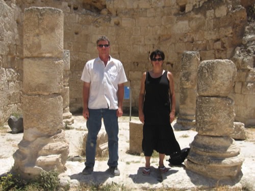Galyn and Toni among the columns of a collapsed portico.
